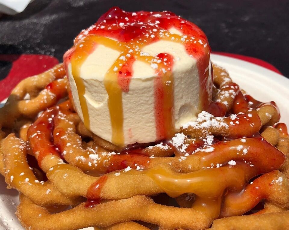 Enjoy a deluxe 8 inch funnel cake – Deep Fried on site 8 inch funnel cakes