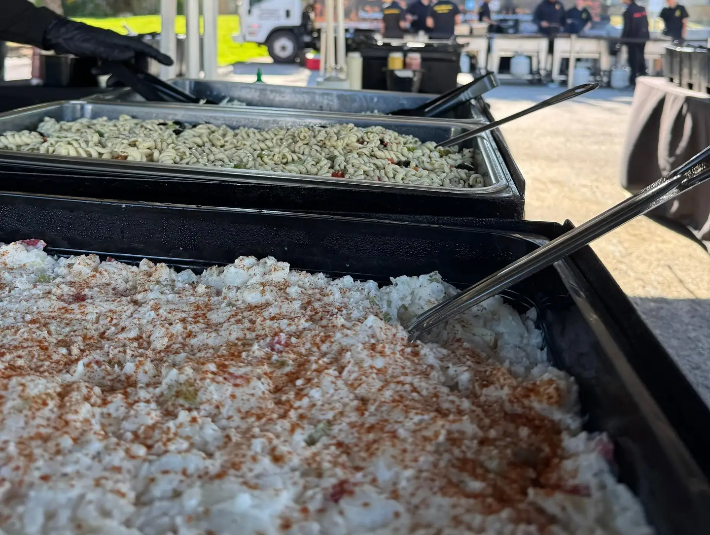 Enjoy ALL THREE SALADS: Traditional Coleslaw, Creamy Potato Salad, and Pasta Salad!